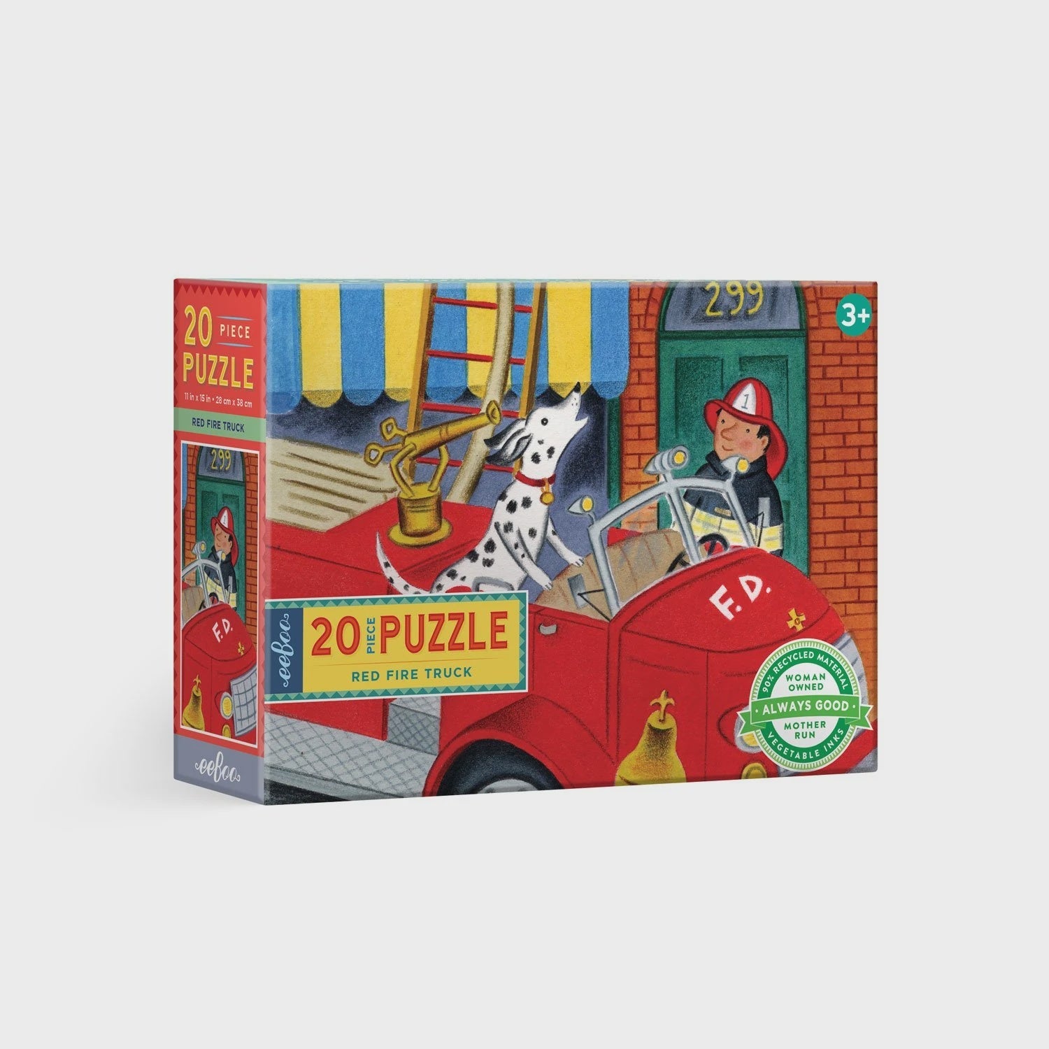 eeBoo's Red Fire Truck 20 piece jigsaw puzzle Piece together a classic red fire truck passing through the town's busy intersection. Can you spot all that's going on? Perfect for ages 3 and up with its jumbo-sized and thick puzzle pieces. Encourages hand-eye coordination, fine motor skills and problem solving.