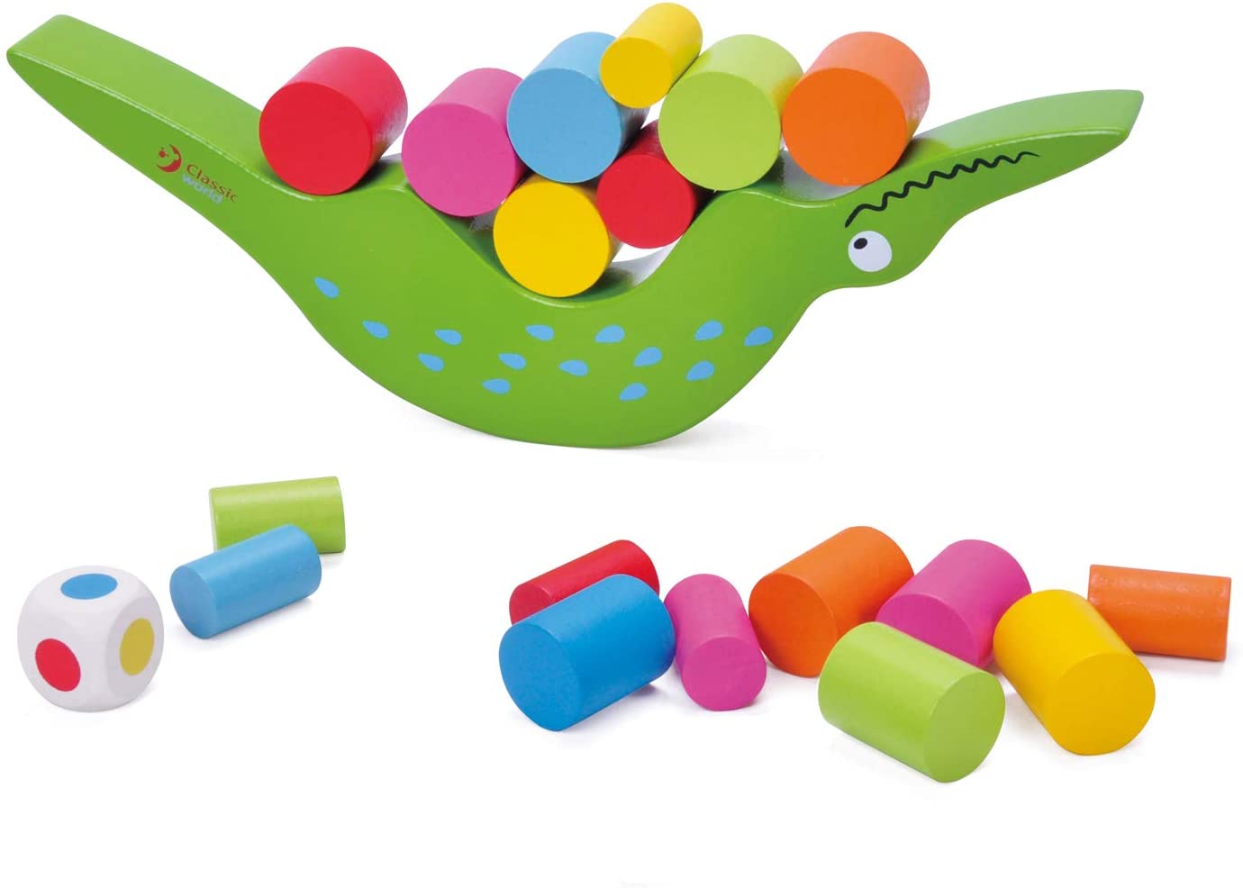 A great game to share with friends, this compact and colourful 23cm activity toy includes a wooden crocodile base, 18 x coloured blocks and 1 x die with corresponding coloured sides for hours of educational entertainment. Perfect for developing hand-eye coordination and mathematical ability, little ones can take all the time they need to balance the colourful blocks on the croc’s tummy in such a way that they don't topple over.