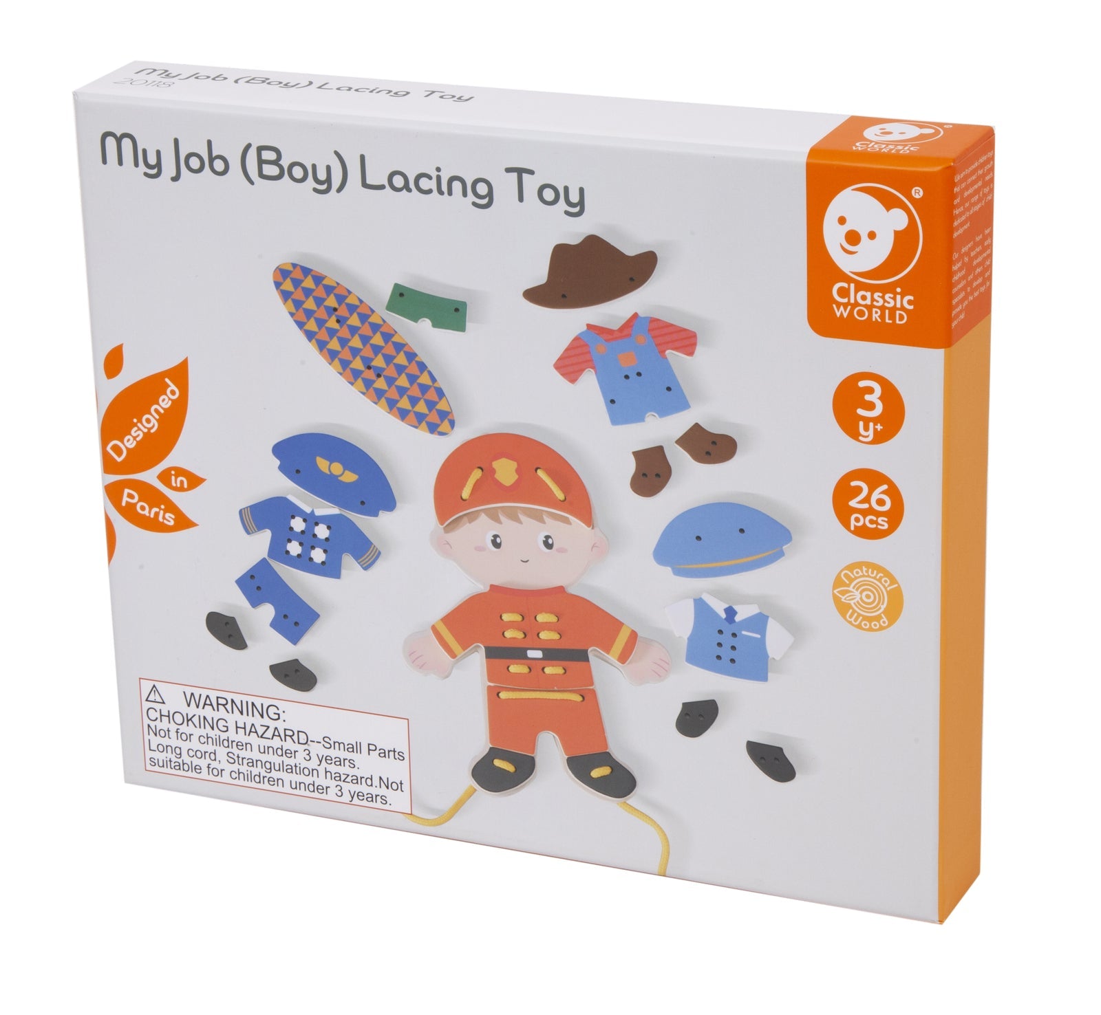 Let them put their boy into different outfits for different jobs. With this wooden toy, they can practice their hand-eye coordination as they lace on the outfits.