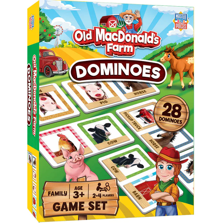Introducing MasterPieces Old MacDonald's Picture Dominoes for Kids! Step onto the farm and let the fun begin. Experience an exciting twist on traditional dominoes with this easy-to-play kids' game. Match tractors, cows, pigs, dogs, and more adorable farm animals to win! Ideal for children aged 3 years and up, this game offers endless entertainment for the whole family with 2-4 players. With quick 10-minute rounds, boredom is never an issue. Get ready to work hard, play harder, and create lasting memories on Old MacDonald's Farm.