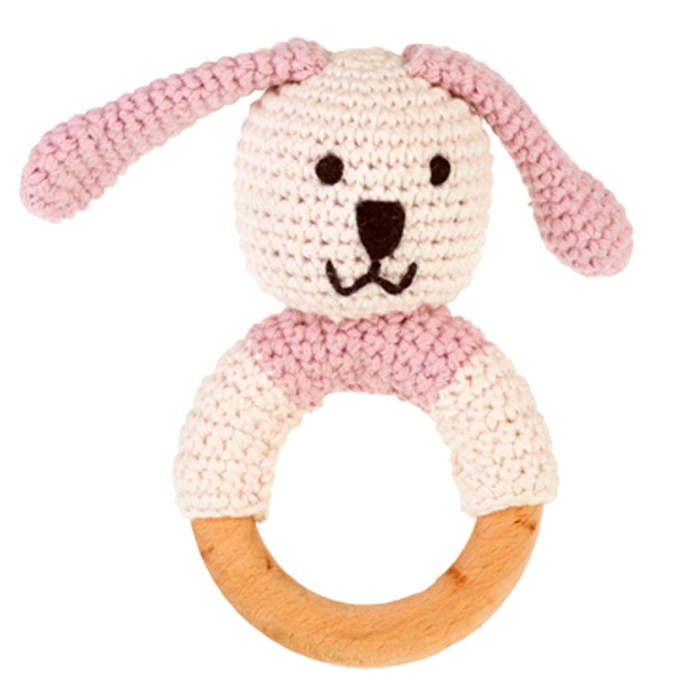 - A small, beech wood ring with a crocheted bunny face and ears.