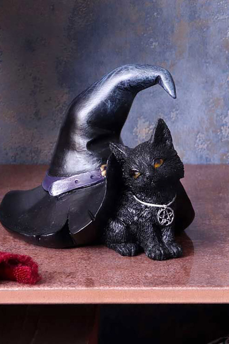 Bewitch your crypt with this occult cat figurine! Painstakingly hand-painted, this mystical statue features a black cat peaking out from under a large witchy hat! Rest this spellbinding statue on your alter, shelf, or curio cabinet to summon Salem spirits in your haunted home! The pawsitively purrfect statue for creepy cat moms, witches, and metalheads with a soft spot for spooky kitties!