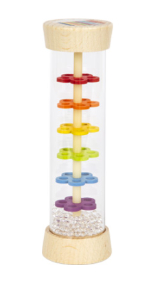 Now that's what rain sounds like! The sound of gentle rain can be imitated with this rainmaker. Since it can be used in many ways as a rattle, a rhythm, a noise toy or a calming game for the senses, children won't be the only ones being carried away by its sounds. The rainmaker's transparent tube provides clear viewing of the little balls with a glass look which trickle down through the perforated plates in the shapes of flowers. This toy trains both acoustic and visual perception.