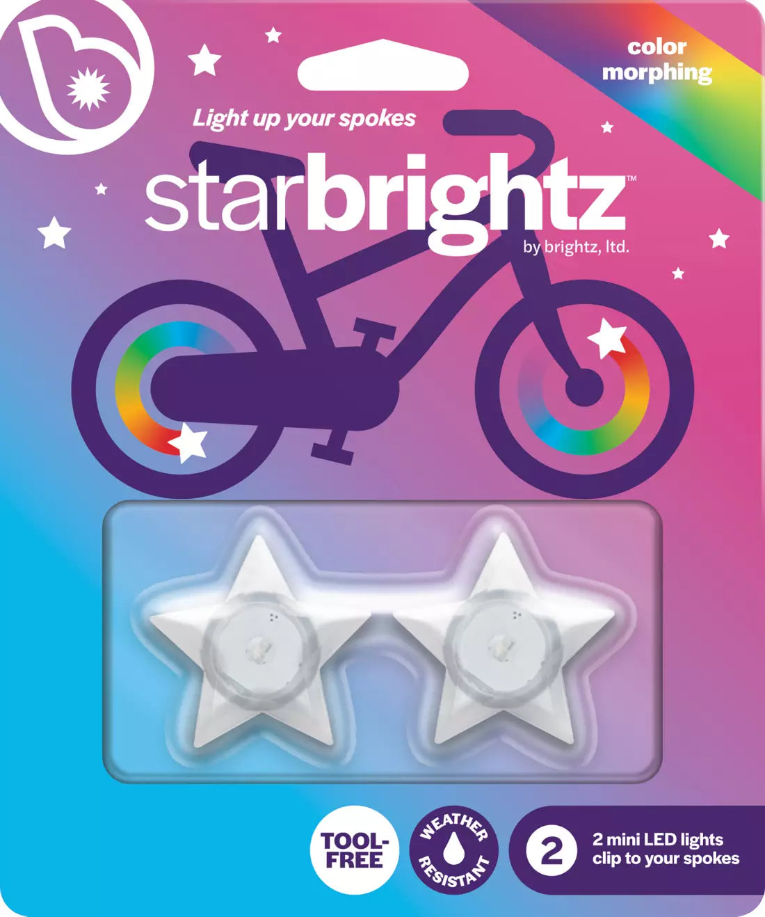 Starbrightz mini LED bicycle spoke lights add easy, quick fun to your bike! These fun little lights create a ring of color morphing light as you ride. Just clip them on to any standard, round spoke and you're ready to roll! Just twist the lights to turn them on or off. Two CR927 batteries are included and can easily by replaced. Lights will last up to 24 hours on one set of batteries.