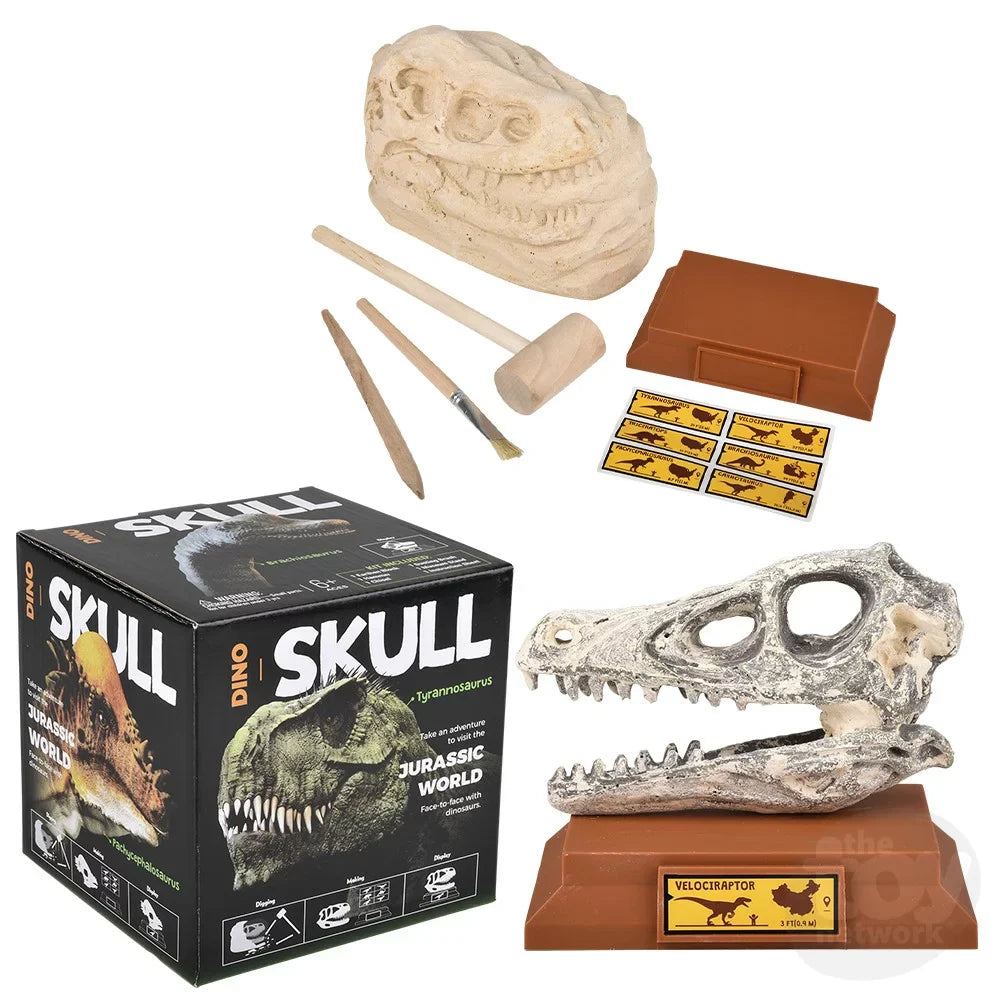 Uncover a mystery fossil with this 6.5" Dinosaur Skull Excavation kit! You'll feel like a real paleontologist as you break, dig, and brush away the dirt to uncover your skull. Afterwards, use the stickers to properly label your display based off which dinosaur you got. Then prop it up on the display stand to showcase your hard work! Each set includes hammer, pick, brush, display stand, stickers, and fossil. Sold by the set. Each set in color box.